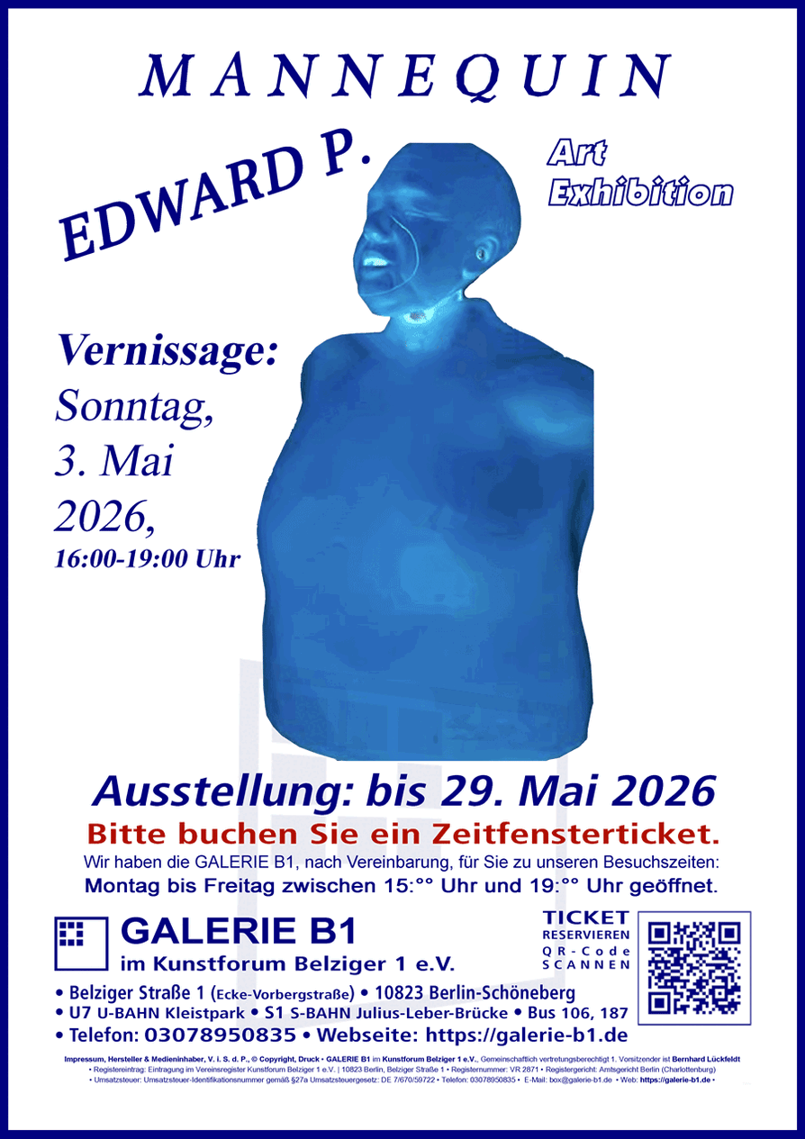 +++ GALERIE B1, Vernissage: Sonntag, 3. Mai 2026, 16:00-19:00 Uhr, M A N N E Q U I N, Edward P. Bitte buchen Sie ein Zeitfensterticket. Ausstellung: bis 29. Mai 2026 +++ GALERIE B1, Vernissage: Sonntag, 3. Mai 2026, 16:00-19:00 Uhr, M A N N E Q U I N, Edward P. Bitte buchen Sie ein Zeitfensterticket. Ausstellung: bis 29. Mai 2026