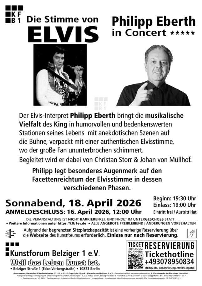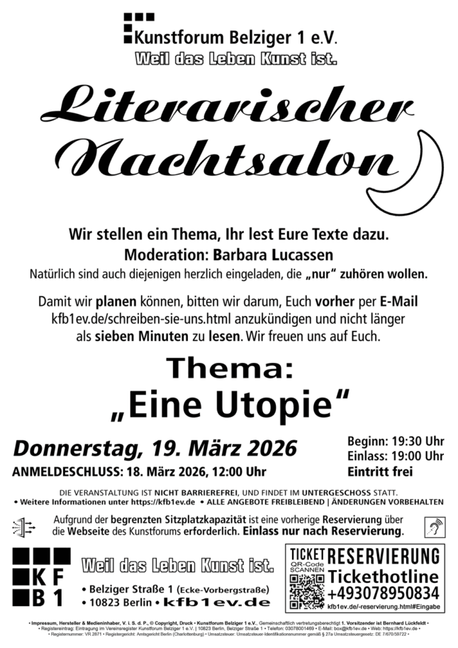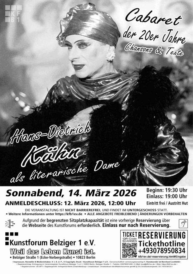 Sonntag, 15. März 2026Vernissage (Einlass ab 16:00 bis 19:00 Uhr)Einlass nur nach Reservierung.Eintritt: freiGALERIE B1Veranstaltungsdetails:AnmeldeschlussReservierung: erforderlich bis spätestens 13. März 2026, 12:00 UhrOrt: GALERIE B1 im Kunstforum Belziger 1 e.V., Belziger Straße 1 (Ecke Vorbergstraße),10823 Berlin-SchönebergANGEBOT FREIBLEIBEND! | ÄNDERUNGEN VORBEHALTEN!